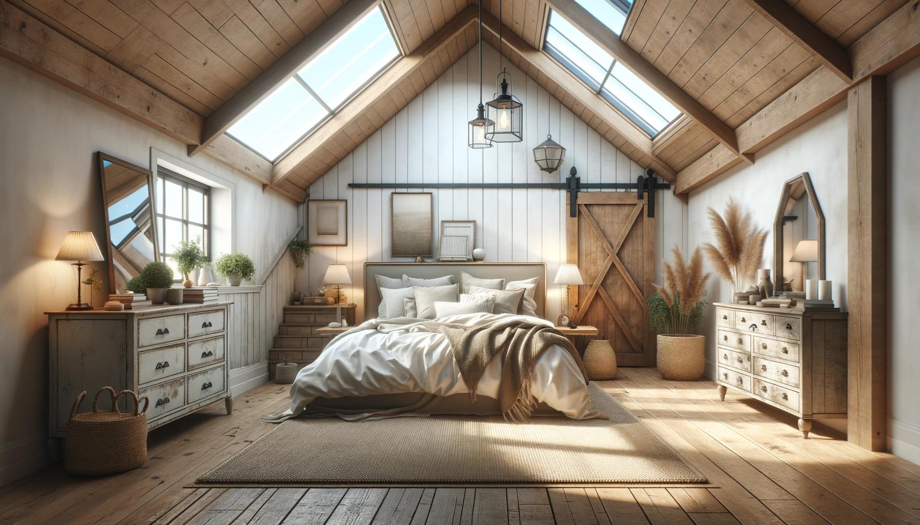 Meble w takiej sypialni często są wykonane z postarzanego lub surowego drewna, a niektóre z nich mogą być nawet stuletnimi antykami, znalezionymi na targach staroci. Świetliki dachowe w tym ustawieniu nie tylko rozświetlają przestrzeń, ale również eksponują naturalne piękno drewna i starannie dobranych antyków, tworząc wyjątkową atmosferę. Ich obecność w sypialni modern farmhouse dodaje nowoczesnego charakteru, jednocześnie zachowując ducha tradycyjnego, wiejskiego domu.